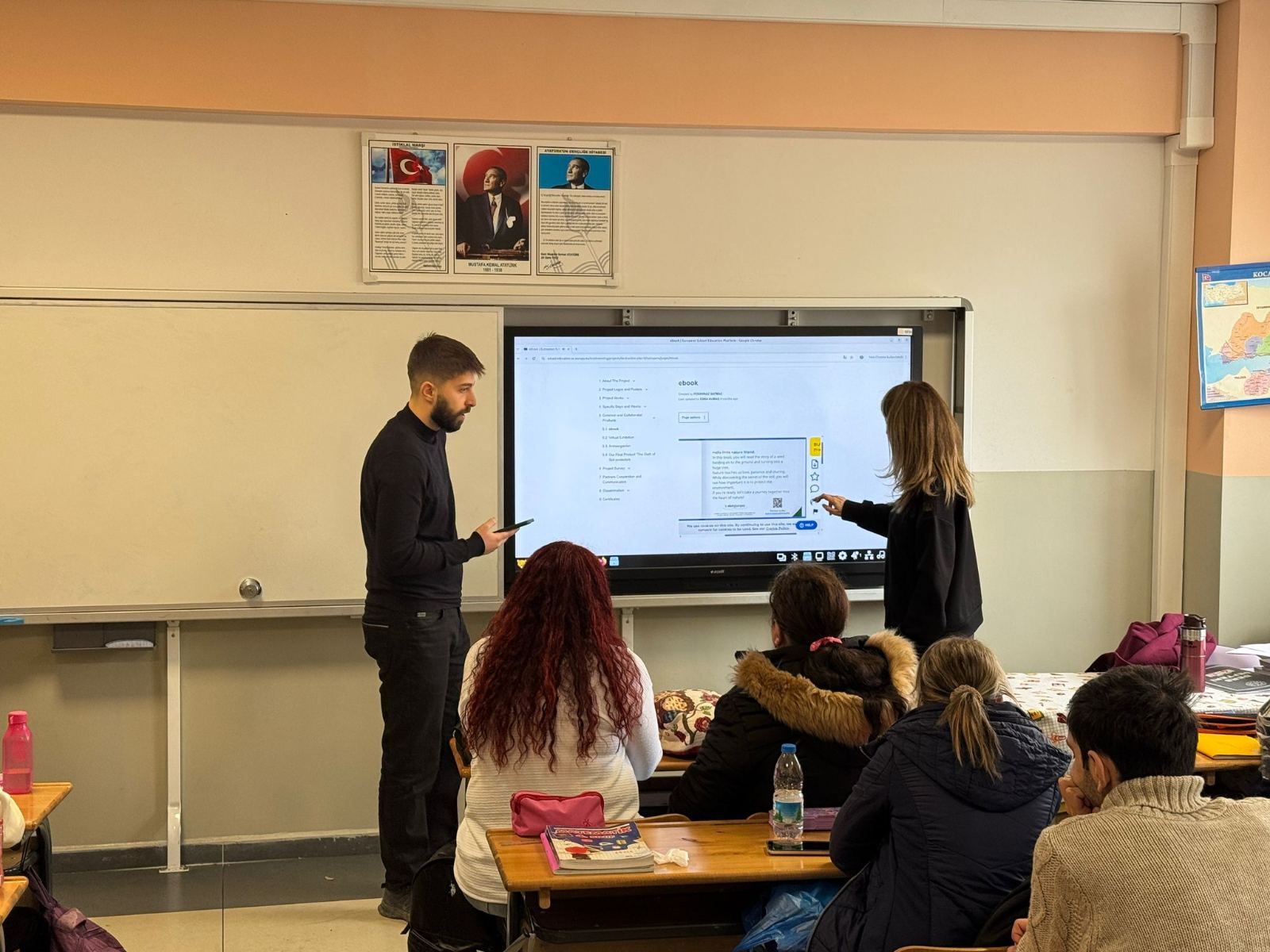 Инженерните специалисти от Турция – Коджаели, Измит представят практически знания и умения за използването на технологиите и приложението на АI в образованието като наш верен и ефективен помощник.Учителите  се запознаха  с уеб платформите Kahoot и Genially.